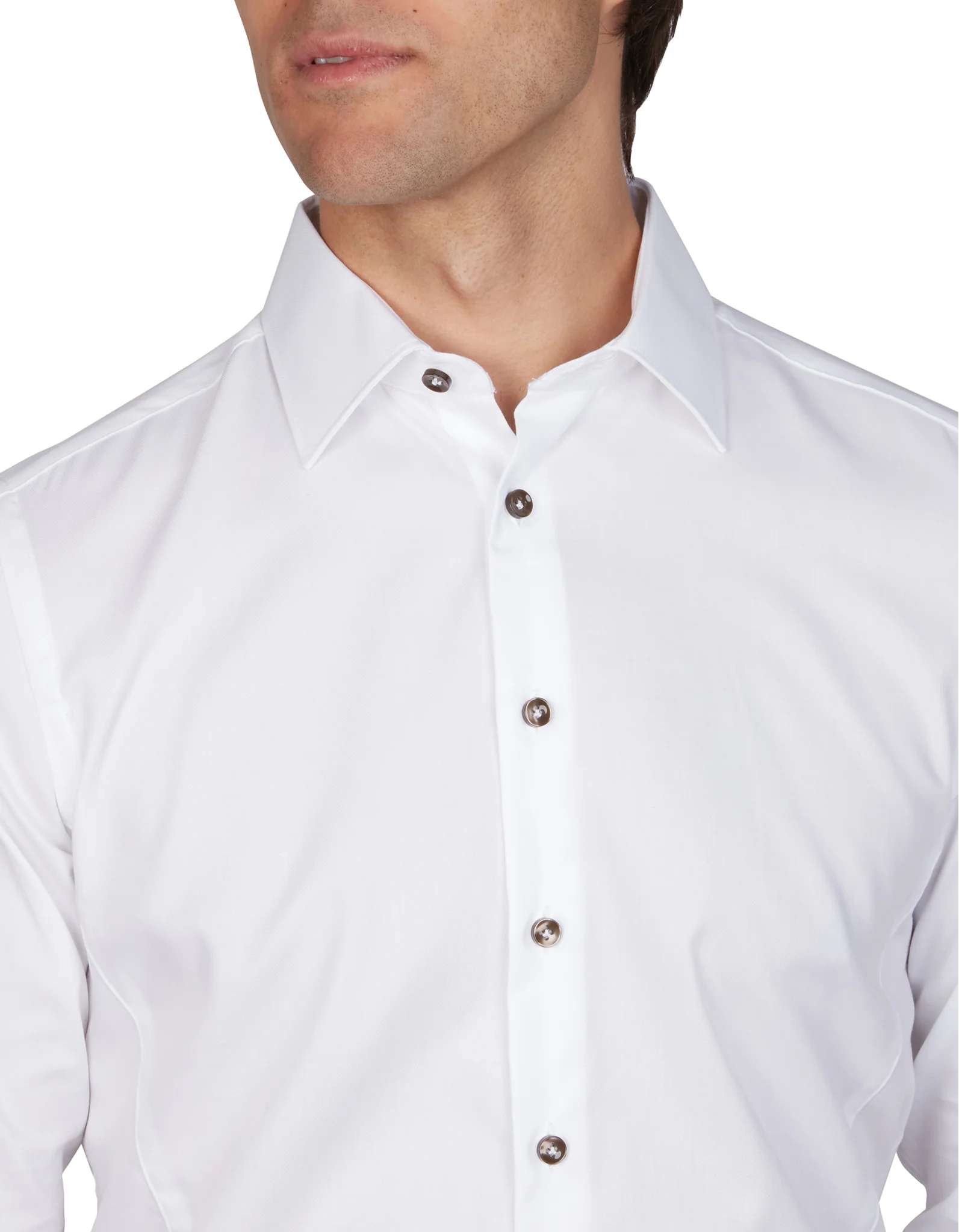 Our classic white shirt with the added interest of chocolate colored buttons. Made from pure 100% fine cotton for a luxury feel and weight